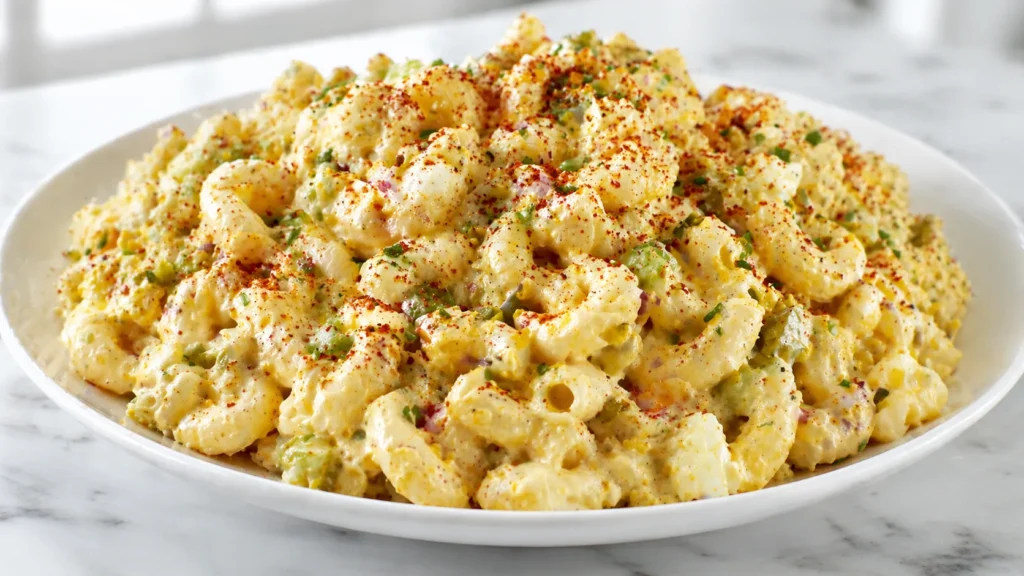 Some side dishes blend into the plate before you even notice them. They’re fine, they’re familiar, and they don’t cause much excitement. Deviled egg pasta salad does not have that problem.